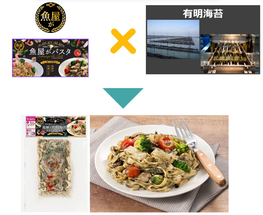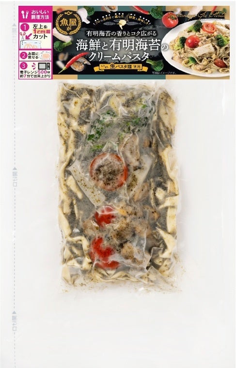 そしてこの度、新たな取り組みとして**地域特産品である「有明海苔」**に着目し、生パスタ麺・フェットチーネを使用した新商品 『魚屋がパスタ 海鮮と有明海苔のクリームパスタ』 を発売いたします。本商品は、イカとあさりの海鮮の旨みに有明海産焼きのりの香りを重ね、和素材を活かした無添加クリームソースで仕立てた、「魚屋が」ならではの和の発想によるクリームパスタです。