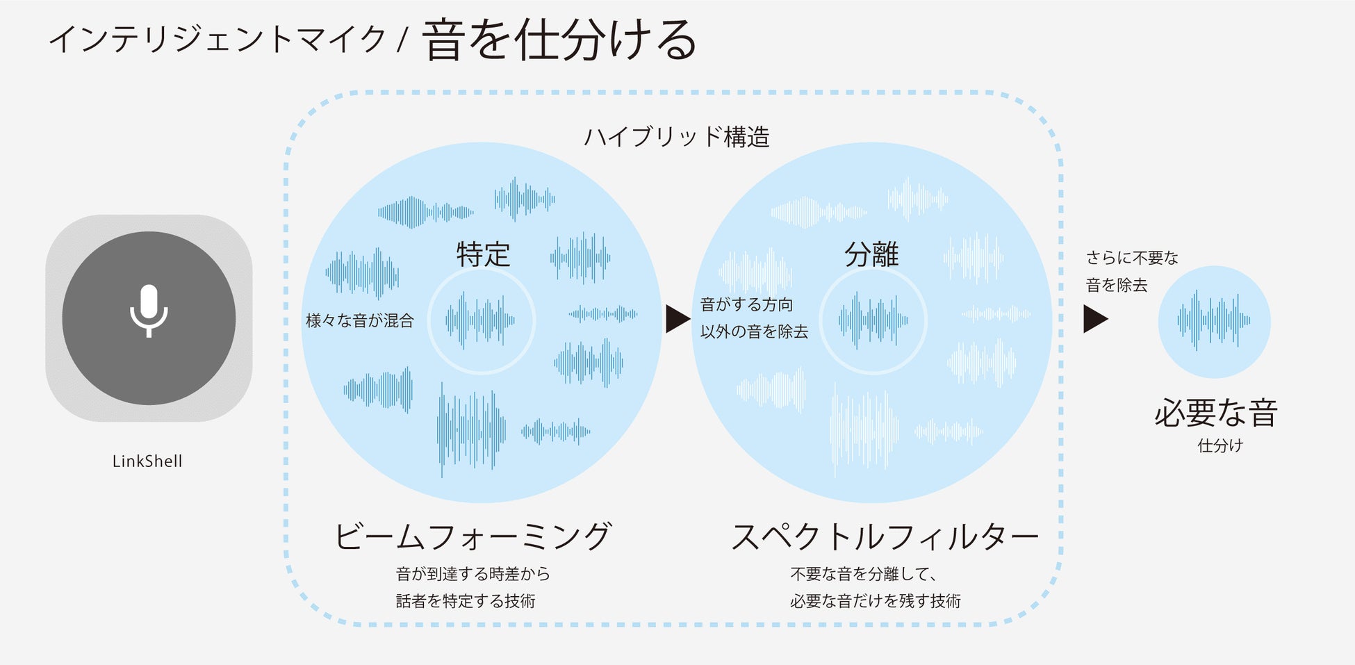NTTの特許技術である「インテリジェントマイク」は、音が2つのマイクに到達する時間差を利用して、音響空間を認識。ビームフォーミングとスペクトルフィルターをハイブリッドで処理することで、「必要な声」だけをクリアに取り出します。