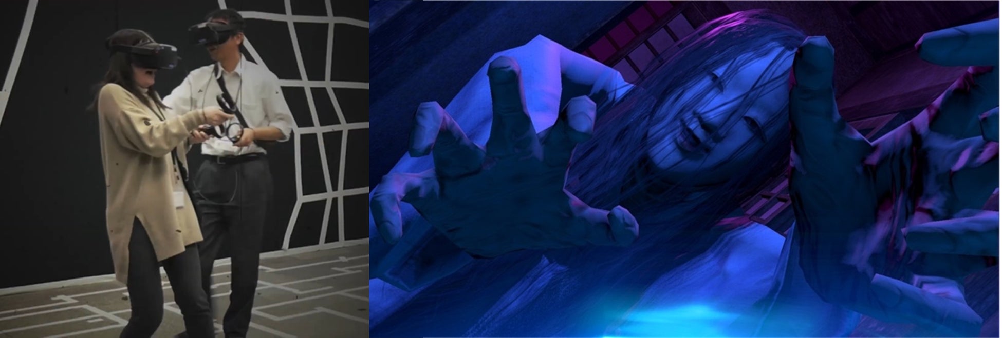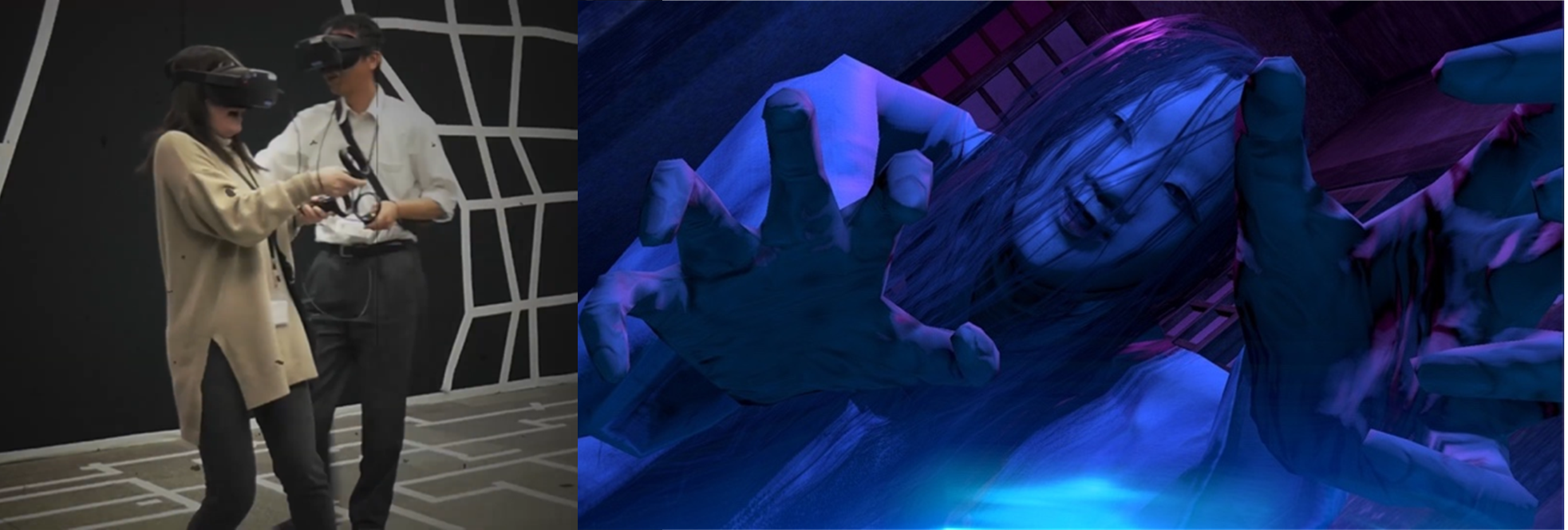 当社は夏の風物詩である「お化け屋敷」を担当させていただいており、イベント用にリアルなお化け屋敷を建造するのは困難ですが、4m四方のスペースでVRによる本格的なお化け屋敷体験を再現しております。
