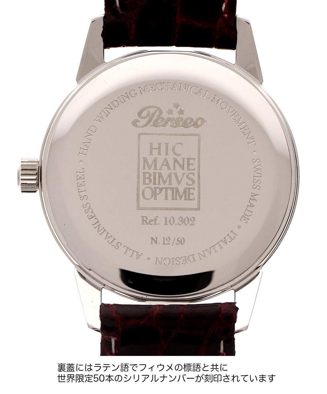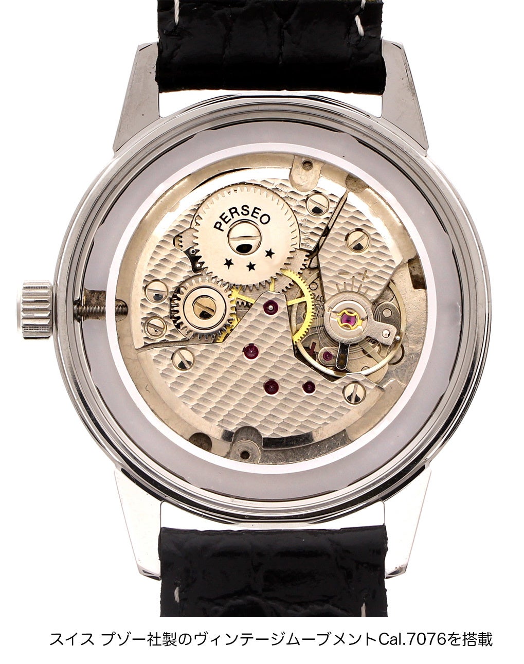 「インプレサ ディ フィウメ」の駆動部分には世界の一流メーカーから選ばれ続けるスイス プゾー社製ヴィンテージムーブメントCal.7076を搭載。機械式手巻きムーブメントというクラシカルな仕様に加え、ケース径36mmという往時を思わせる小ぶりでドレッシーなサイズ感も魅力です。