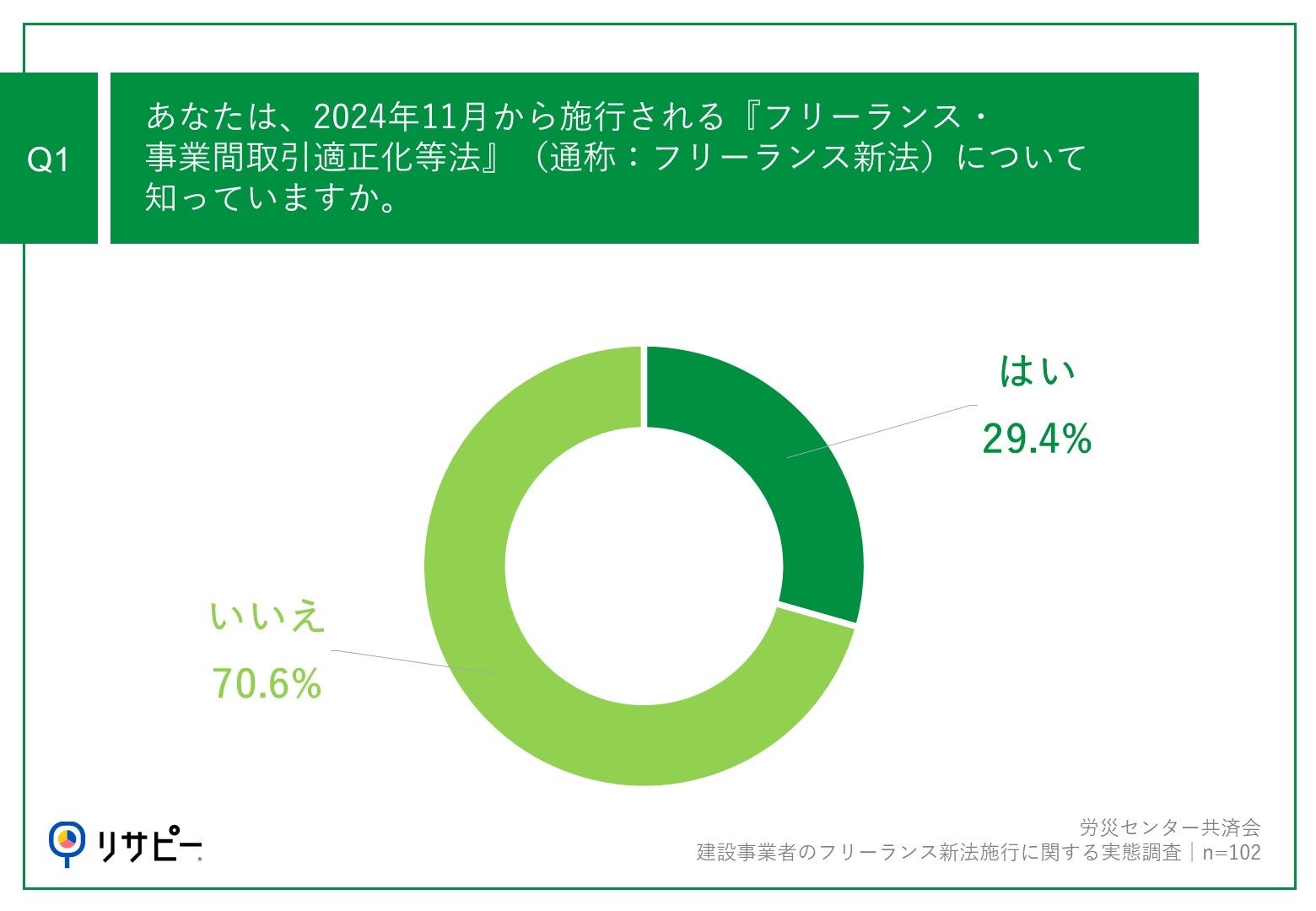 「Q1.あなたは、2024年11月から施行される『フリーランス・事業間取引適正化等法』(通称:フリーランス新法)について知っていますか。」(n=102)と質問したところ、「はい」が29.4%、「いいえ」が70.6%という回答となりました。