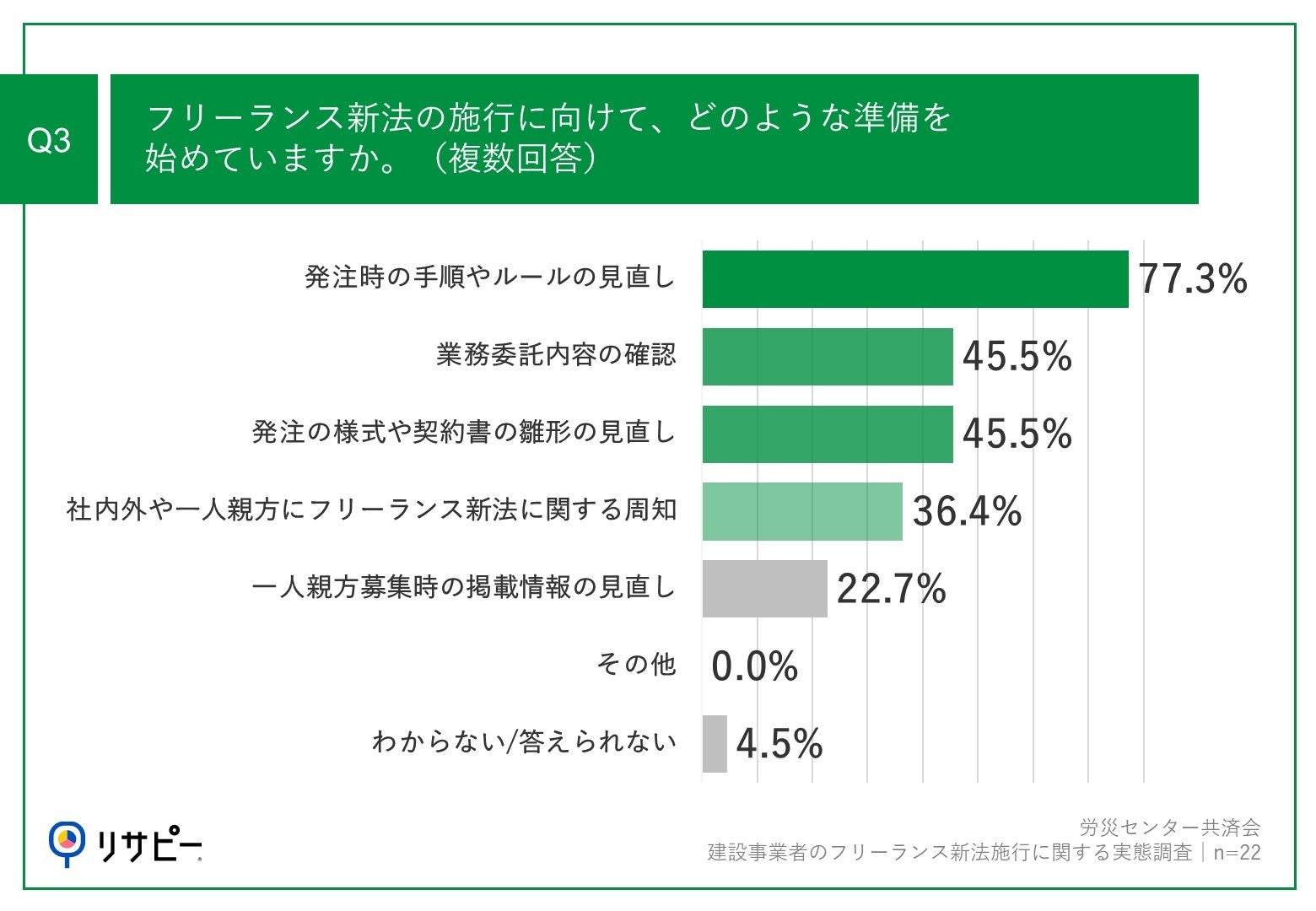 Q2で「はい」と回答した方に、「Q3.フリーランス新法の施行に向けて、どのような準備を始めていますか。(複数回答)」(n=22)と質問したところ、「発注時の手順やルールの見直し」が77.3%、「業務委託内容の確認」が45.5%、「発注の様式や契約書の雛形の見直し」が45.5%という回答となりました。