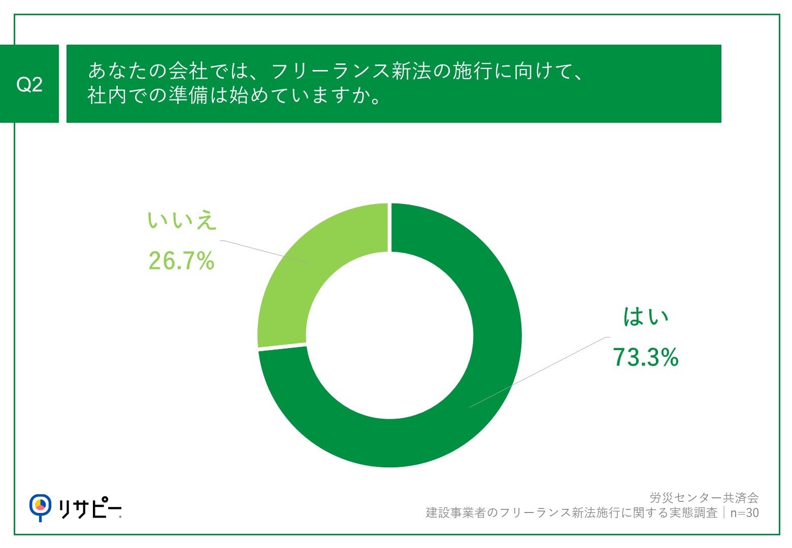 Q1で「はい」と回答した方に、「Q2.あなたの会社では、フリーランス新法の施行に向けて、社内での準備は始めていますか。」(n=30)と質問したところ、「はい」が73.3%、「いいえ」が26.7%という回答となりました。