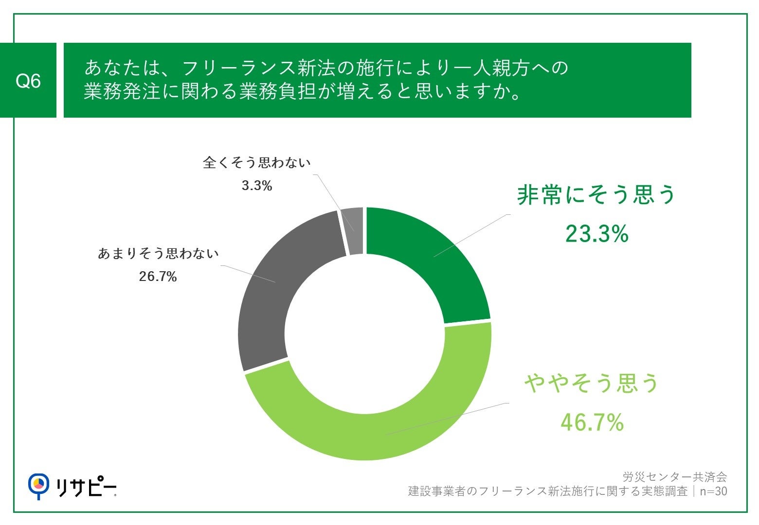 Q1で「はい」と回答した方に、「Q6.あなたは、フリーランス新法の施行により一人親方への業務発注に関わる業務負担が増えると思いますか。」(n=30)と質問したところ、「非常にそう思う」が23.3%、「ややそう思う」が46.7%という回答となりました。