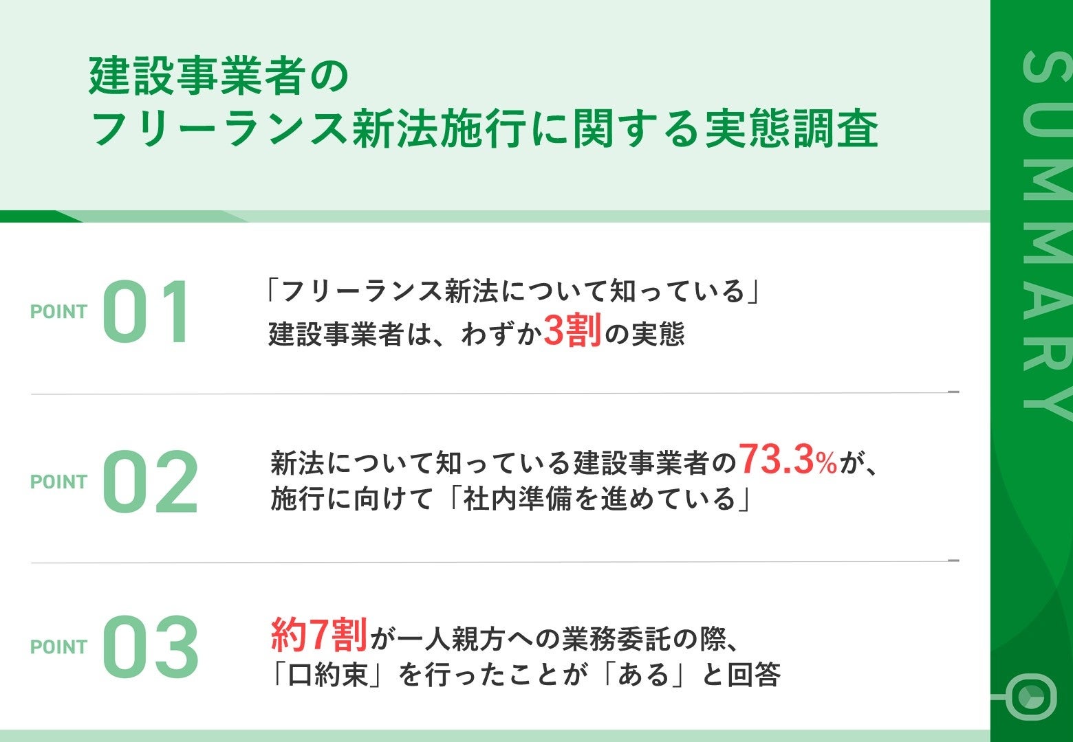【「フリーランス新法」まもなく施行、建設事業者の対応実態を調査】「フリーランス新法」を認知する事業者はわずか3割