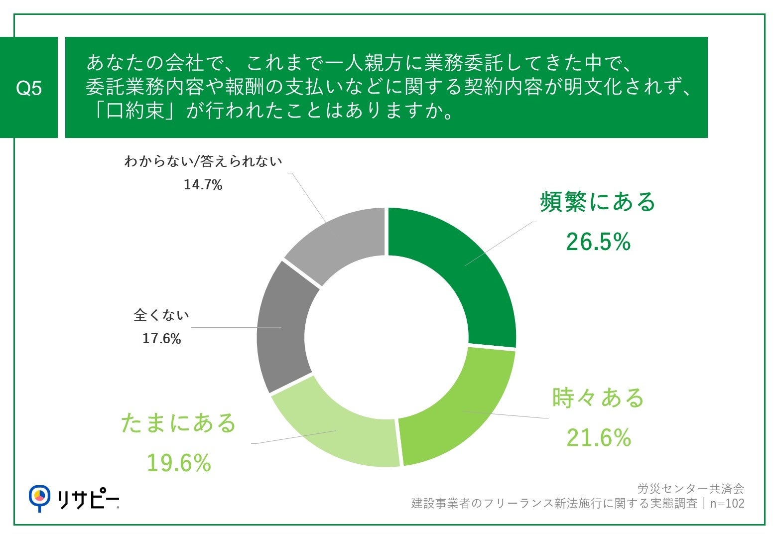 「Q5.あなたの会社で、これまで一人親方に業務委託してきた中で、委託業務内容や報酬の支払いなどに関する契約内容が明文化されず、「口約束」が行われたことはありますか。」(n=102)と質問したところ、「頻繁にある」が26.5%、「時々ある」が21.6%、「たまにある」が19.6%という回答となりました。