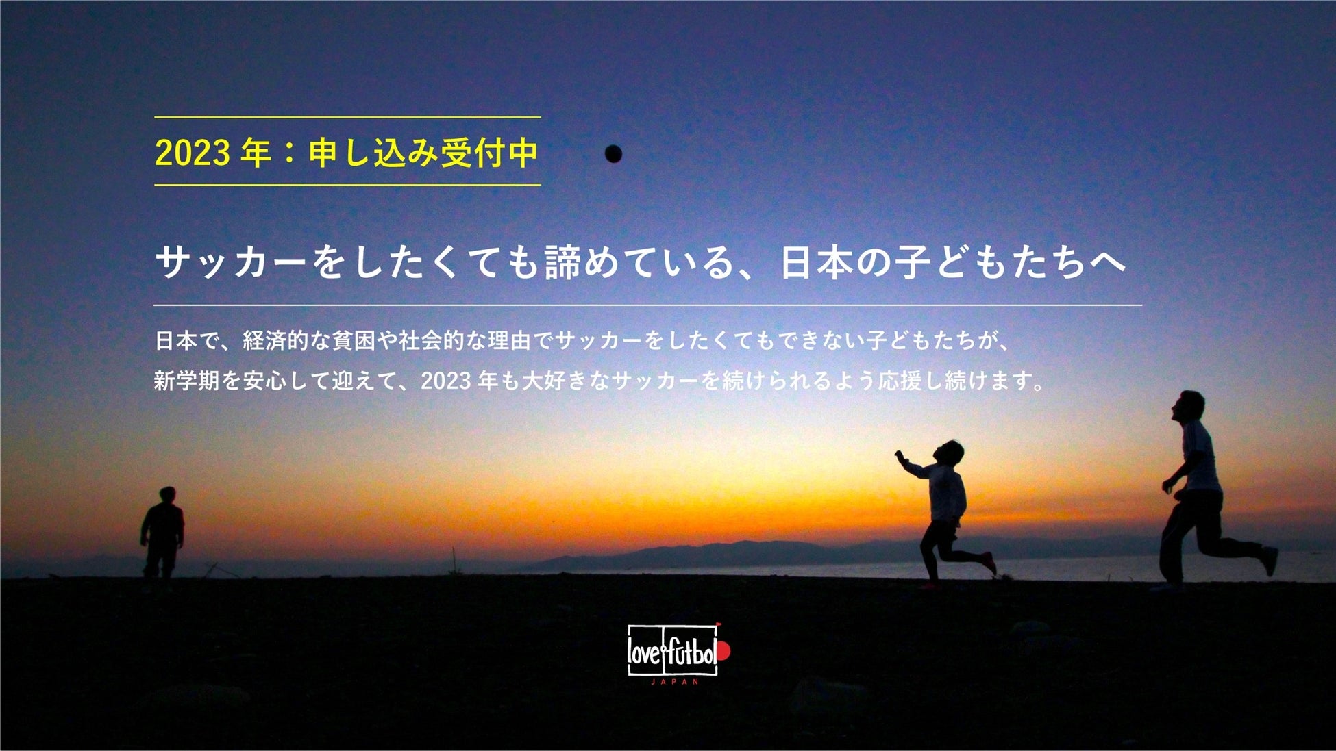 世界各地で子どもたちのサッカー環境改善に取り組むlove.fútbol Japan(ラブフットボール・ジャパン)は、日本国内で、経済的な貧困や社会的な理由でサッカーをしたくても諦めている、または続けることに悩んでいる子ども・若者が、新学期を安心して迎えてサッカーを続けられるように奨励金5万円給付、用具寄贈、心のつながりを育てるプロサッカー選手とのサッカー交流の支援をおこないます。
