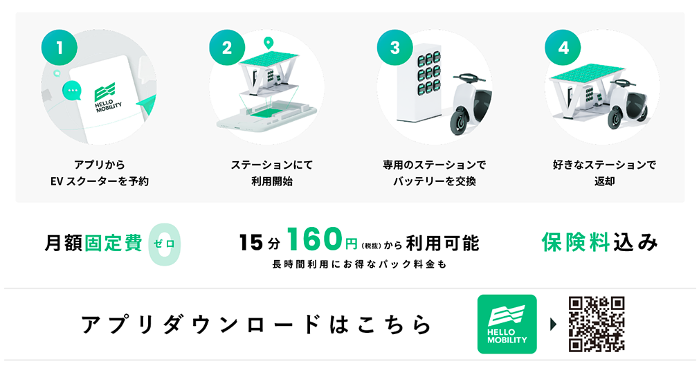 モビリティ(EVスクーター等)が設置されているステーションから、「HELLO MOBILITY」のアプリを使ってモビリティを選択し、移動距離やその時の気分に合わせた方法で移動できるシェアサービスです。モビリティは、超小型 EVカーシェア、スクーター、EV スクーターを展開しており、モビリティのステーション検索、予約・決済およびバッテリー交換ステーションの検索・利用まで簡単に行うことができます。