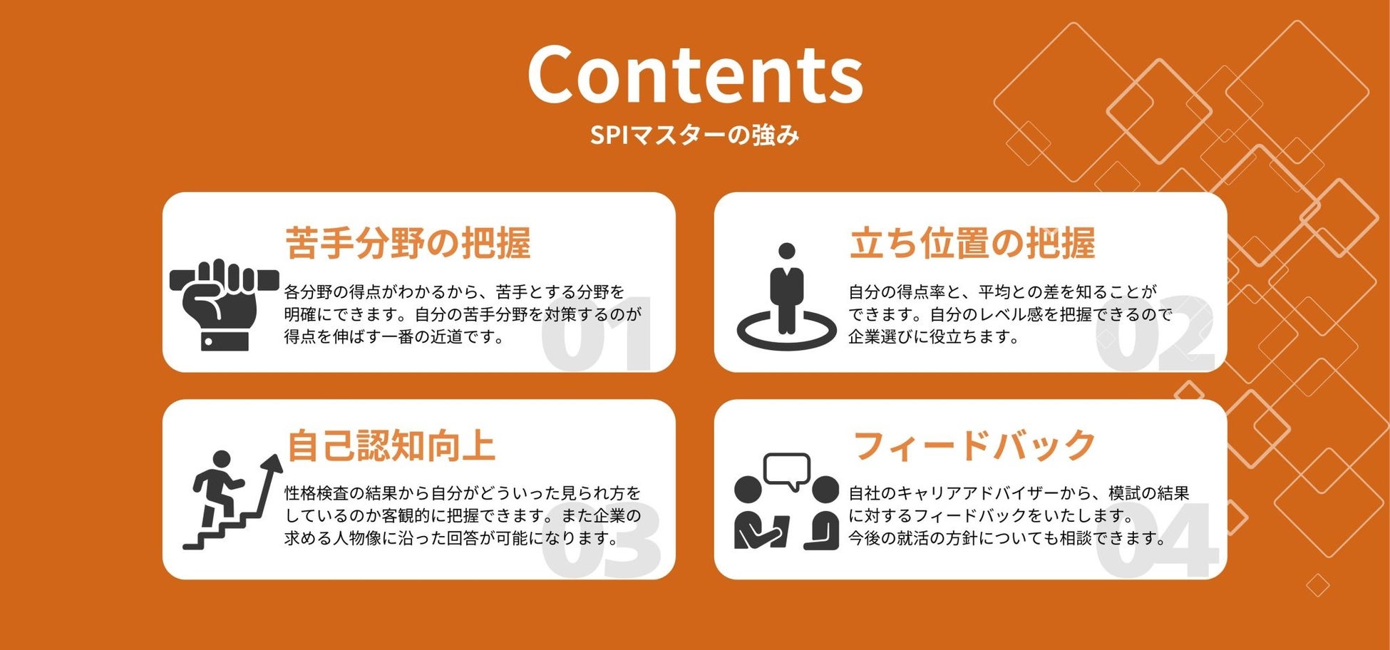 SPIマスターでは、模試結果を通じて自己理解を深め、次のステップに向けた準備を万全にします。以下のポイントが強みです。