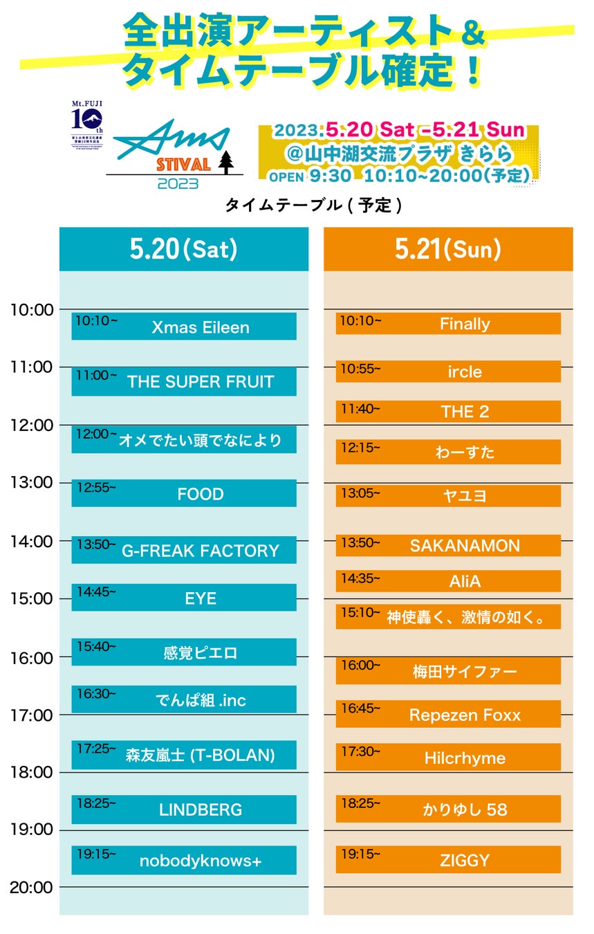 富士山が世界文化遺産に登録されて10周年、その記念すべき年に山梨県山中湖交流プラザきららでAMSフェスティバルを開催できることになりました!いよいよ今週末に開催です!そして全出演者とタイムテーブルが確定しました!Repezen Foxx、かりゆし58、リンドバーグ、でんぱ組.incなどレジェンドから超人気アーティストまで幅広く集結します!ちぃたんもグリーティングに会場に来てくれます!お子様から大人まで全世代が楽しめるフェスになります!!是非会場に来て一緒に盛り上がりましょう!