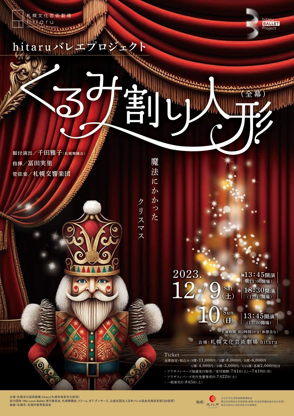 札幌文化芸術劇場 hitaruが、地元のバレエ団体、実演芸術家などの協力を得て、hitaruを舞台とした新たなバレエ作品を創造・発信する「hitaru バレエプロジェクト」。その記念すべき第1回公演として、この冬「くるみ割り人形」を全幕上演します。オーディションで選ばれた北海道の約90名のダンサーにゲストダンサーを迎え、大迫力の美術、照明、演奏とともにお贈りする、特別なクリスマスの物語をお楽しみください。