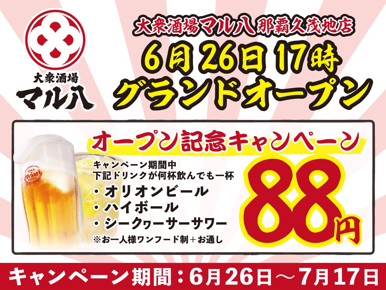 "早い・安い・旨い"をコンセプトに「近くにあると嬉しい」お店を目指して作り上げた「大衆酒場 マル八 那覇久茂地店」(FC運営:GET株式会社、本社:福岡県福岡市、代表取締役社長 此見翔平)が、2025年6月26日(木)にグランドオープンいたします。これを記念して、赤字覚悟の大盤振る舞いで<オリオンビール・ハイボール・シークヮーサーサワーが何杯飲んでも1杯88円(税別)!>を、オープン記念キャンペーンとして、2025年6月26日(木)~7月17日(木)の期間限定で実施いたします。