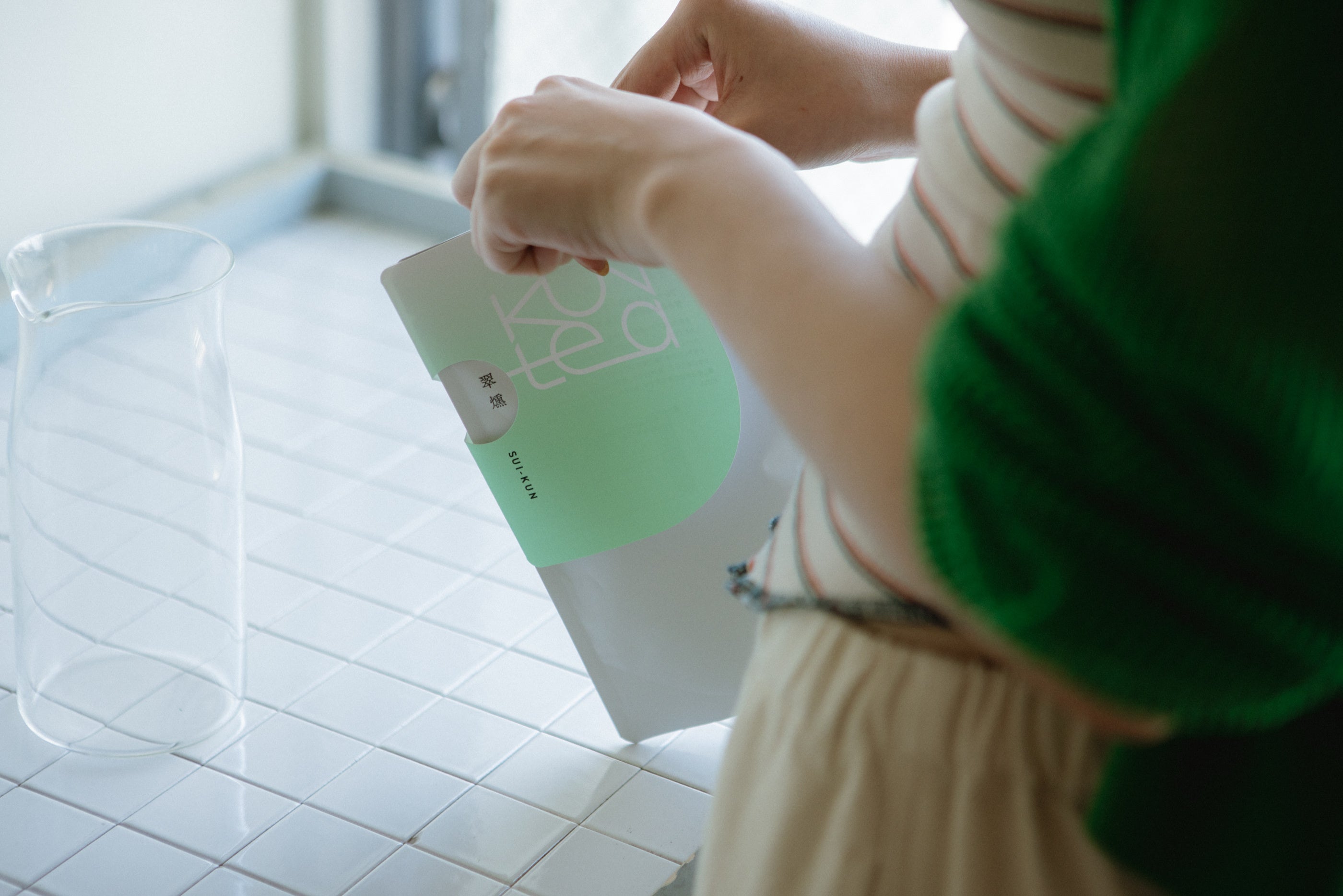 翠燻はテトラ型ティーバッグを採用。水出しで手軽にKUNteaが楽しめるように仕上げています。ティーバッグの中で茶葉が動くテトラ型タイプなので旨みがたっぷり溶け出します。