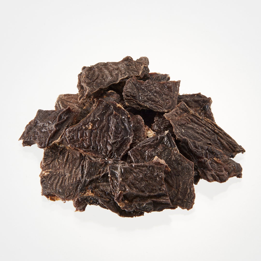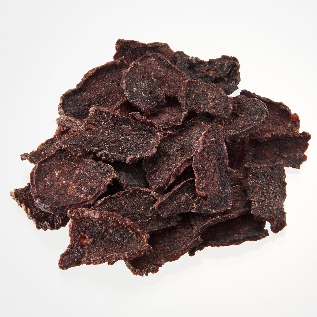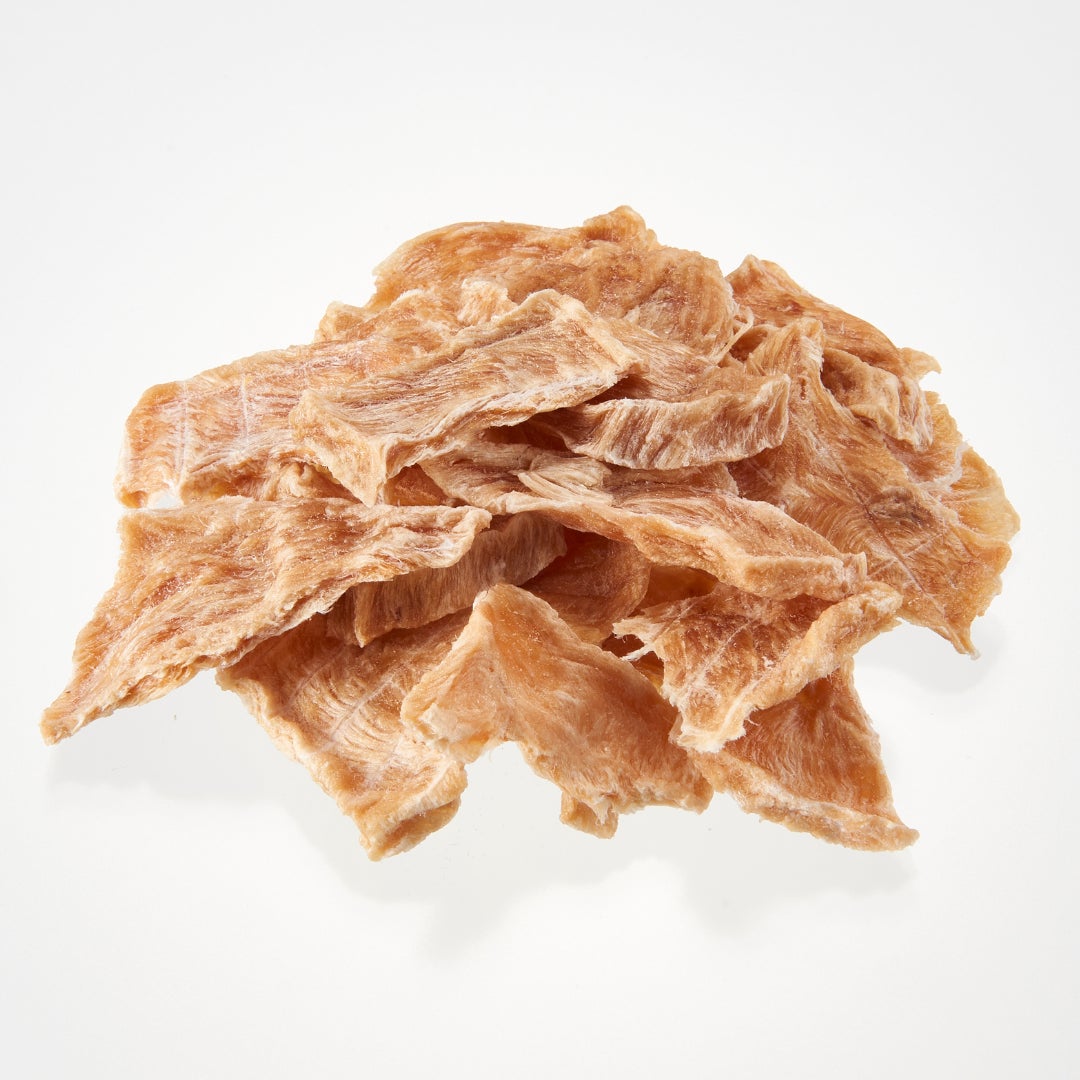 薄く切ったささみをほぼ1日かけて乾燥。温度調整をしつつ仕上げたジャーキーはサクサク食感&やさしい歯ざわり。飼い主さんも食べたくなるくらいの香ばしい香りをお楽しみください。