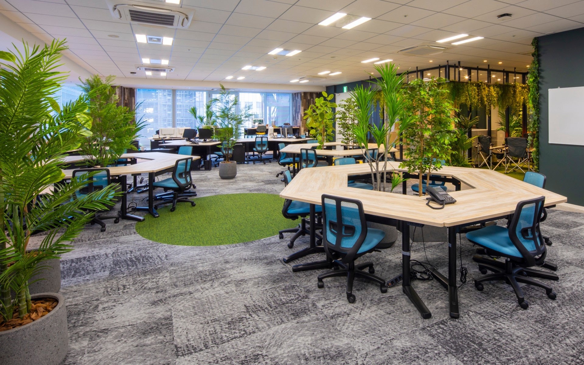 活発なディスカッションによる意思決定やチーム内の情報共有など、コミュニケーションが円滑に行われる職場環境を目指し、オフィス内には人工芝を敷いた交流ブースやフリーアドレス制の執務スペースを導入しています。また、会議室は創造的な空間とすることで新しいアイデアやビジネスが生まれやすい環境整備を実施しました。