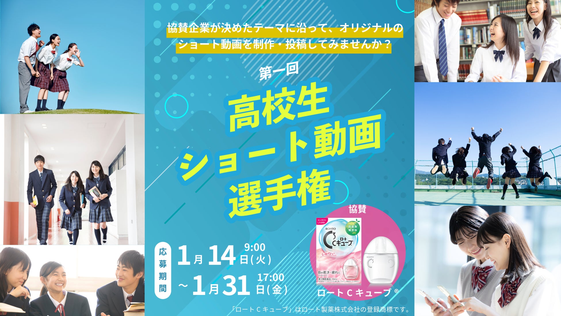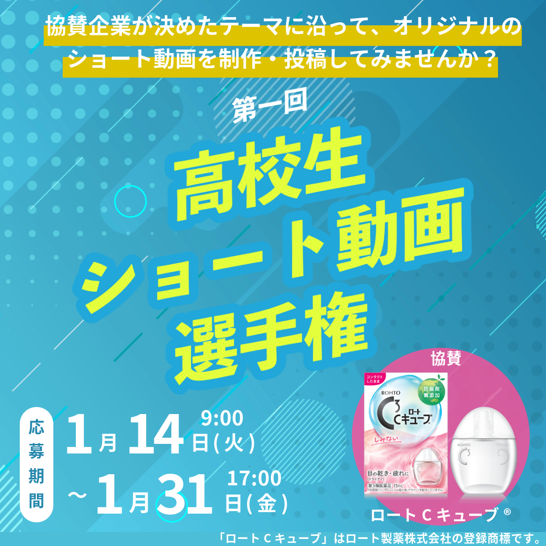 本大会は、協賛企業としてロート製薬株式会社(本社:大阪市生野区、代表取締役社長:杉本 雅史)にご参加いただき、同社の主力商品である 【ロートCキューブ】 をテーマに、選抜された5校の高校生がオリジナルのショート動画を制作・投稿し、競い合うものです。