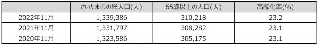 さいたま市の人口・世帯数(2022年11月1日時点)※1によると、さいたま市は人口1,339,386人に対して、65歳以上の高齢者は310,218人、高齢化率は23.2%です。「さいたまいきいき長寿応援プラン2023」※2では、全国と比較すると高齢化率は低い状況であるものの、「団塊の世代」が全て75歳以上となる2025年には、高齢化率25.7%、後期高齢者の割合が15.4%と急増することが予想されています。