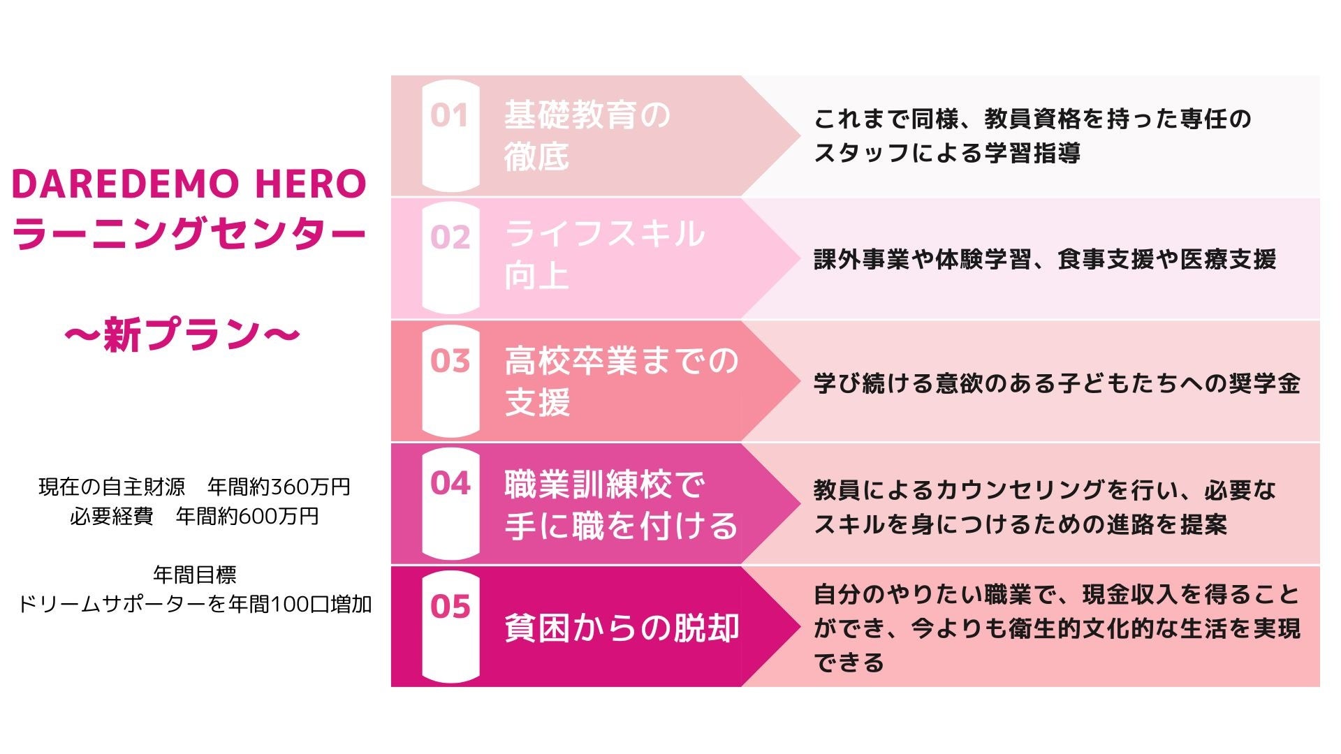 これまでラーニングセンターでは、子どもたちに「最低限の教育」を提供してきました。十分な予算がないまま始めたラーニングセンターで、DAREDEMO HEROが提供できるのは、小学校卒業までの支援に限られています。