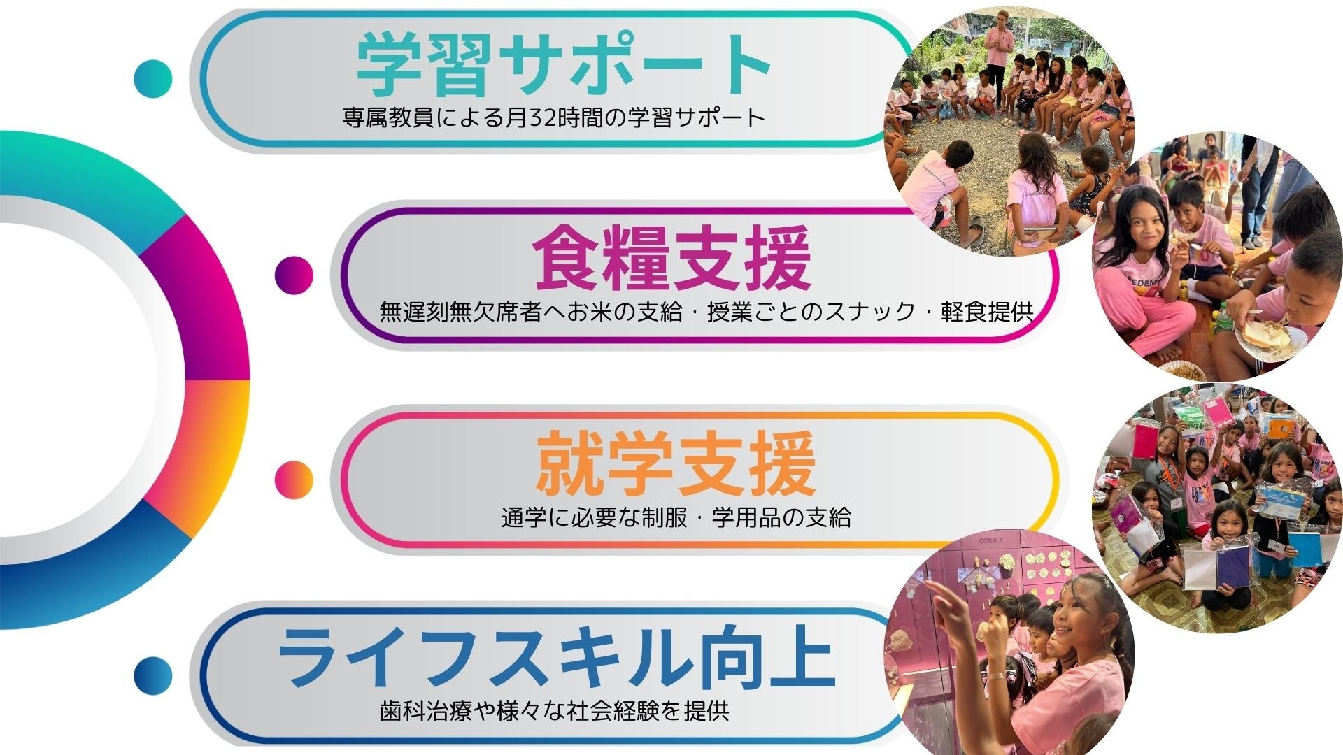 そこで、DAREDMEO HEROではセブの中でも最貧困地区とされる、ゴミ山や墓地に住む子どもたちのために、ラーニングセンターを開設し、以下の支援を続けてきました。