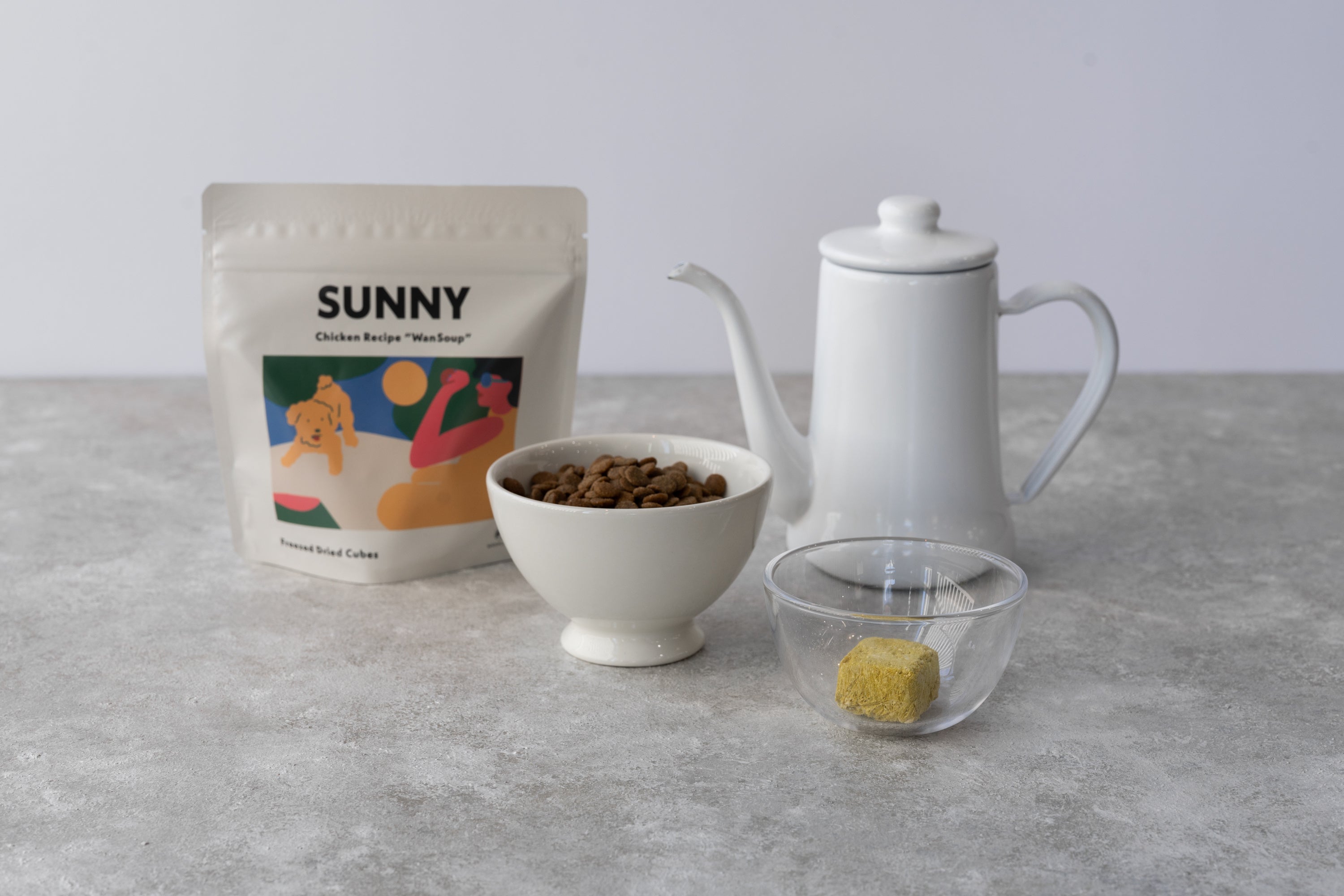 パートナーの体は約70-80%の水分でできています。しかし、市販のドライフードは水分が不足しがちです。そこでオールステージのパートナーたちに美味しく水分を摂取してもらえるよう、このWanSoupを作りました。