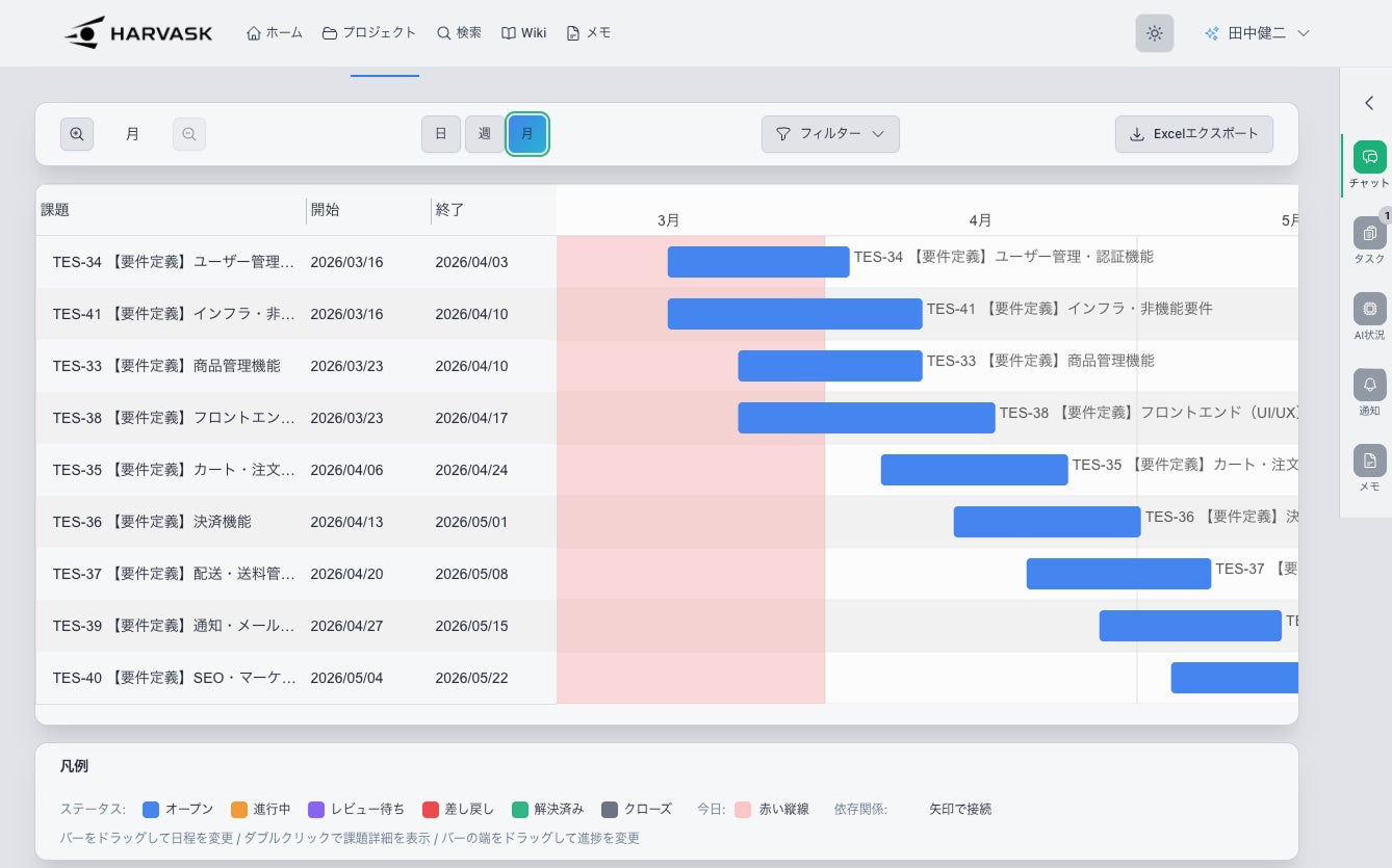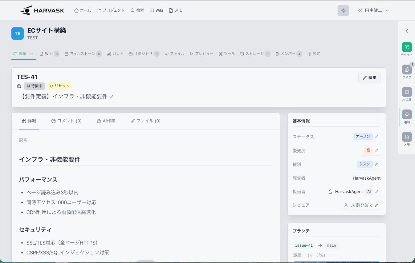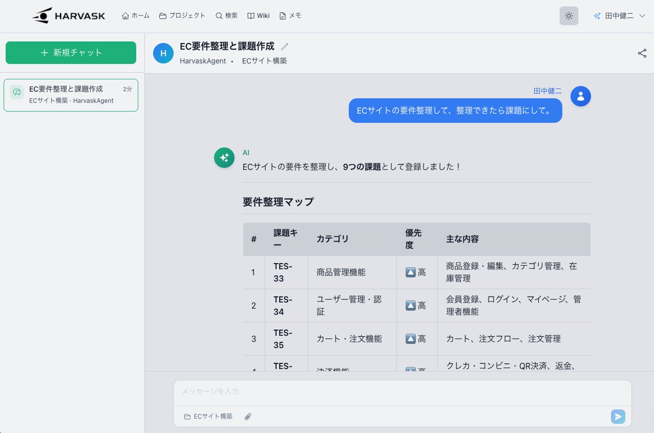 HARVASKは「AIがプロジェクトを動かす」をコンセプトに、プロジェクト管理とAIエージェントの実行基盤をひとつに統合したツールです。