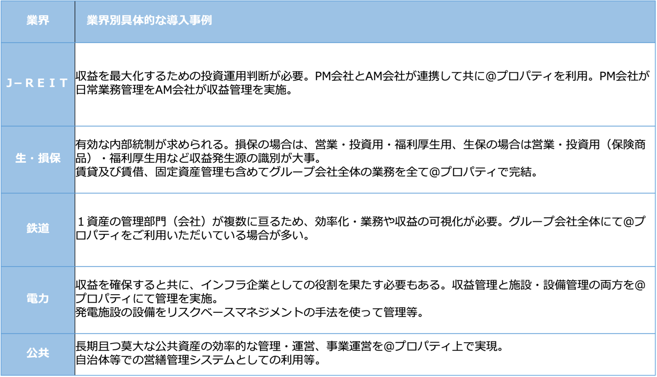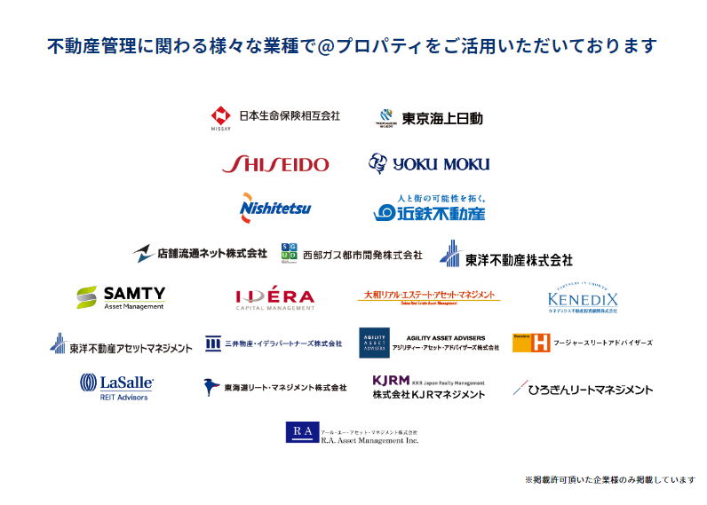 弊社サービス@propertyはリリース以後、REIT・ファンドの皆様を中心にご利用いただいており、トップシェアとなるに至りました。現在はREIT・ファンド様だけではなく様々な業種/業界の企業様にご利用いただいており、不動産管理クラウドとして広がりを見せています。今回のリニューアル、導入企業一覧ページ公開では弊社サービスが不動産関連を主な事業としていない事業会社様も含めて、不動産管理において幅広くご活用いただける点の訴求力強化の目的で実施いたしました。@propertyはお客様の不動産管理における目的や用途に合わせて不動産管理に関わる全ての方にご活用いただける不動産管理クラウドとして今後も精進してまいります。〈業界別導入事例〉