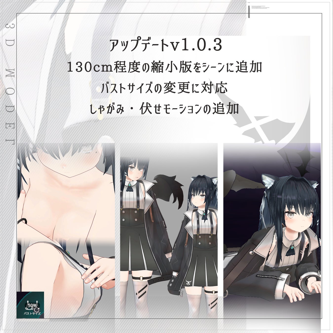 目玉のアップデートは、モデルを約130cmに縮小した縮小版を新たに追加。また、バストサイズの変更にも対応いたしました。この機能により前より自由なカスタマイズをすることができ、更に自分好みのモデルを生み出すことが可能になりました!