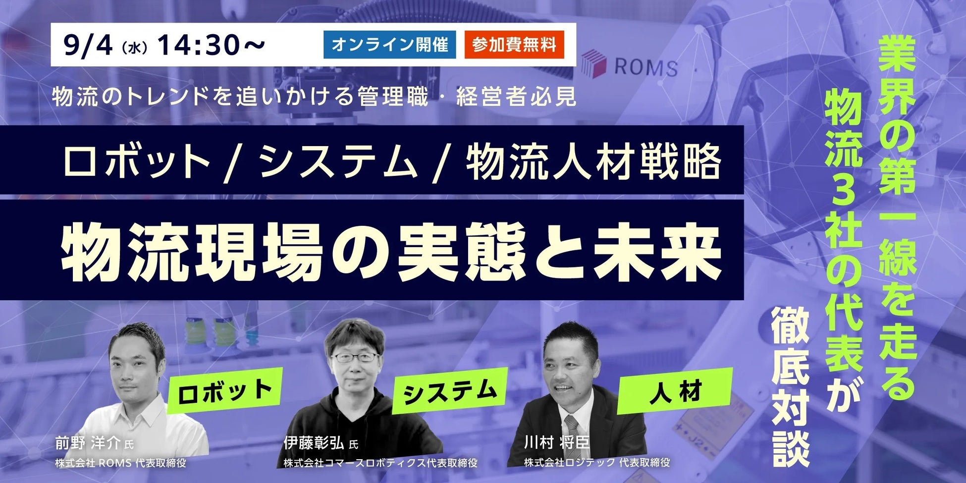 9/4(水)14:30からROMS・コマースロボティクス・ロジテック3社共催ウェビナー「物流現場の実態と未来」を開催します