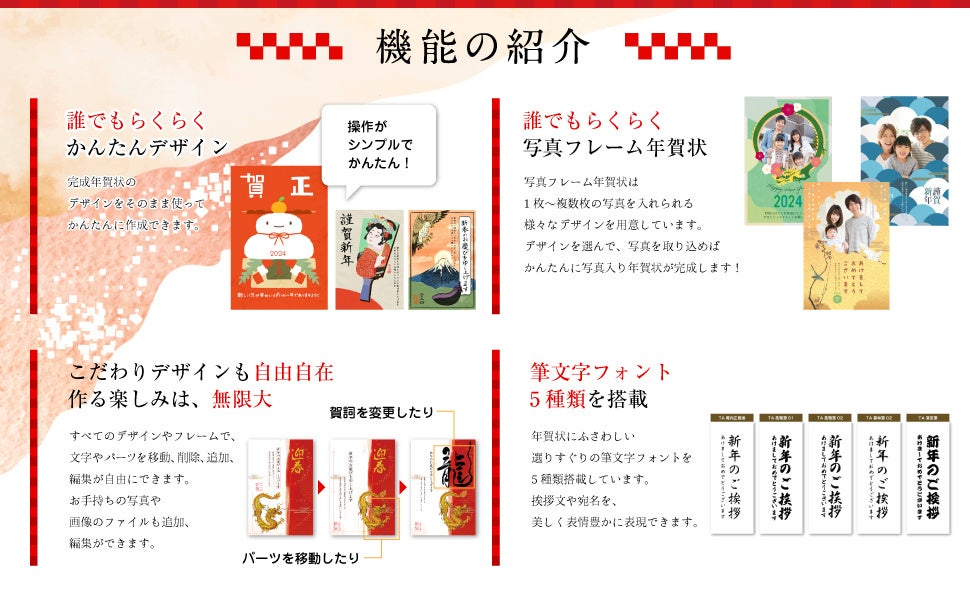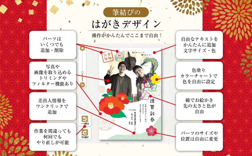 「筆結び」は一年中、様々な用途にご利用いただける多機能なツールです。グリーティングカード、カレンダー、往復はがきなどのデザイン作成に対応しており、スマートフォンを使用していつでもどこでも手軽にデザインが可能です。
