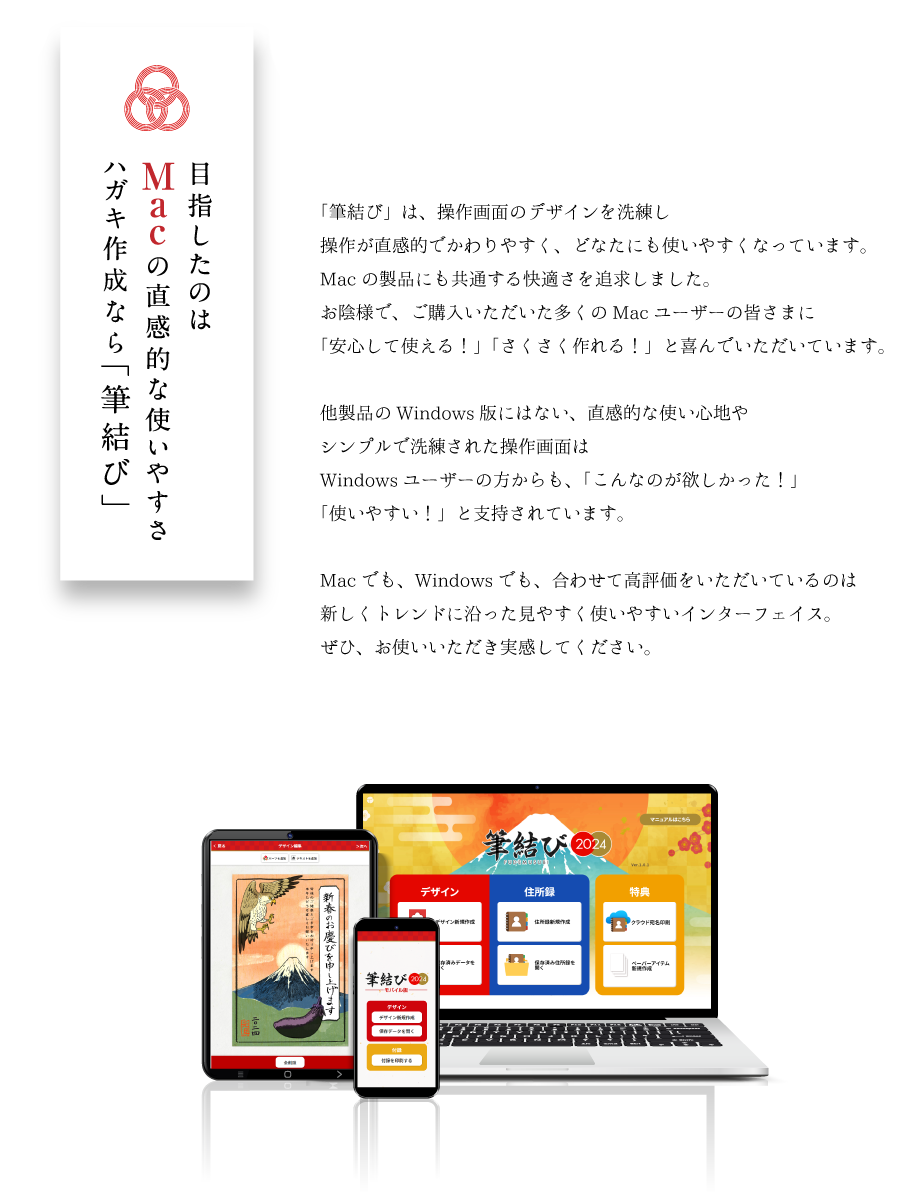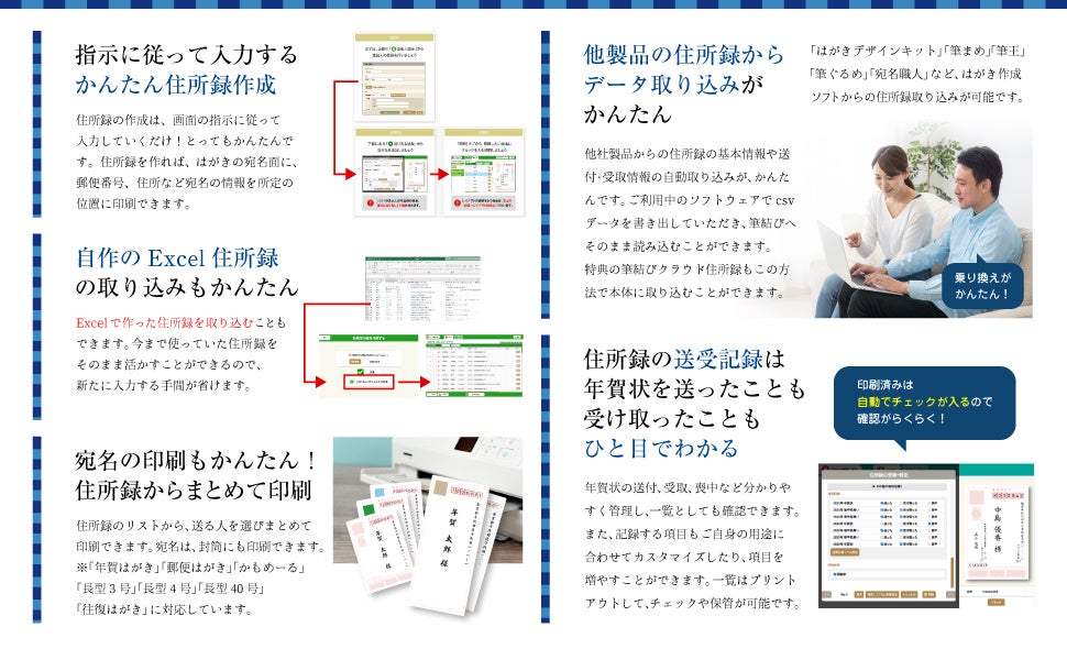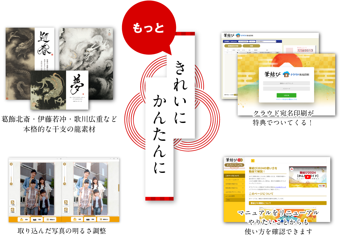 「筆結び2024」は、喪中はがきや年賀状はがきの作成に必要な機能【はがきデザイン・宛名印刷・住所録管理・ハイセンスな素材】がすべて揃ったソフトウェアです。