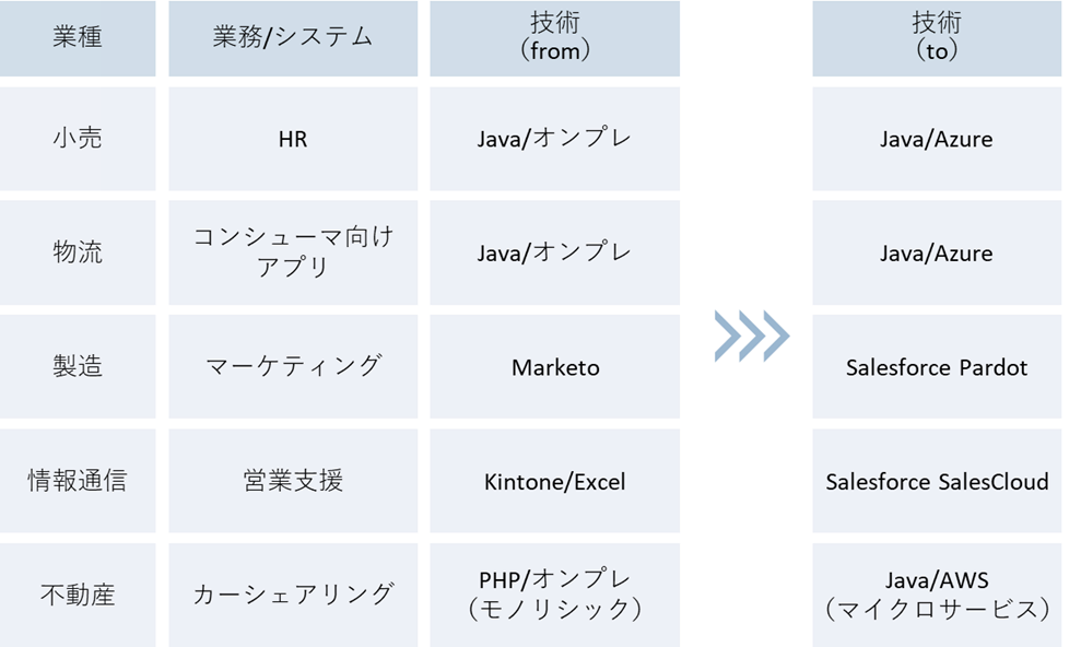 当社のモダナイゼーション事例のサンプルをご紹介します。以下のような業種、技術(from)のシステムをモダン環境へ移行してきました。