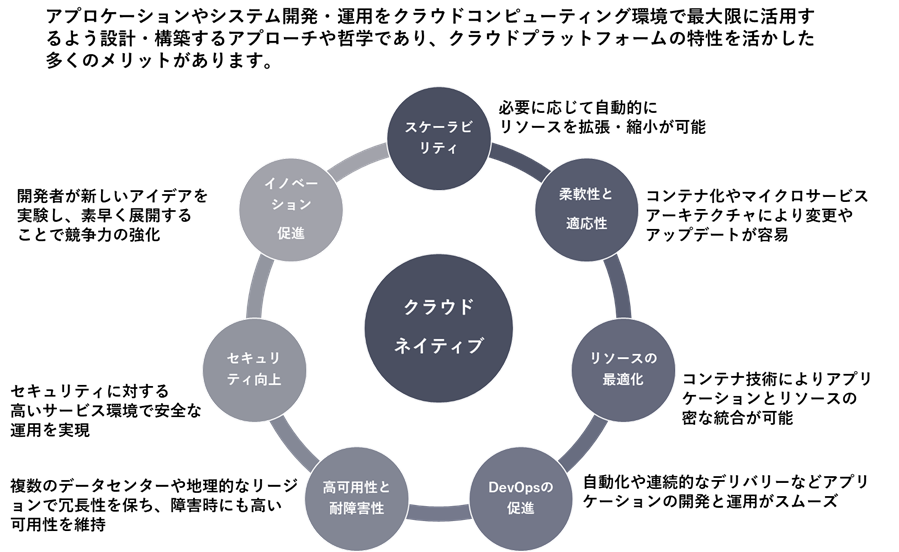 アプロケーションやシステム開発・運用をクラウドコンピューティング環境で最大限に活用するよう設計・構築するアプローチや哲学であり、クラウドプラットフォームの特性を活かした多くのメリットがあります。
