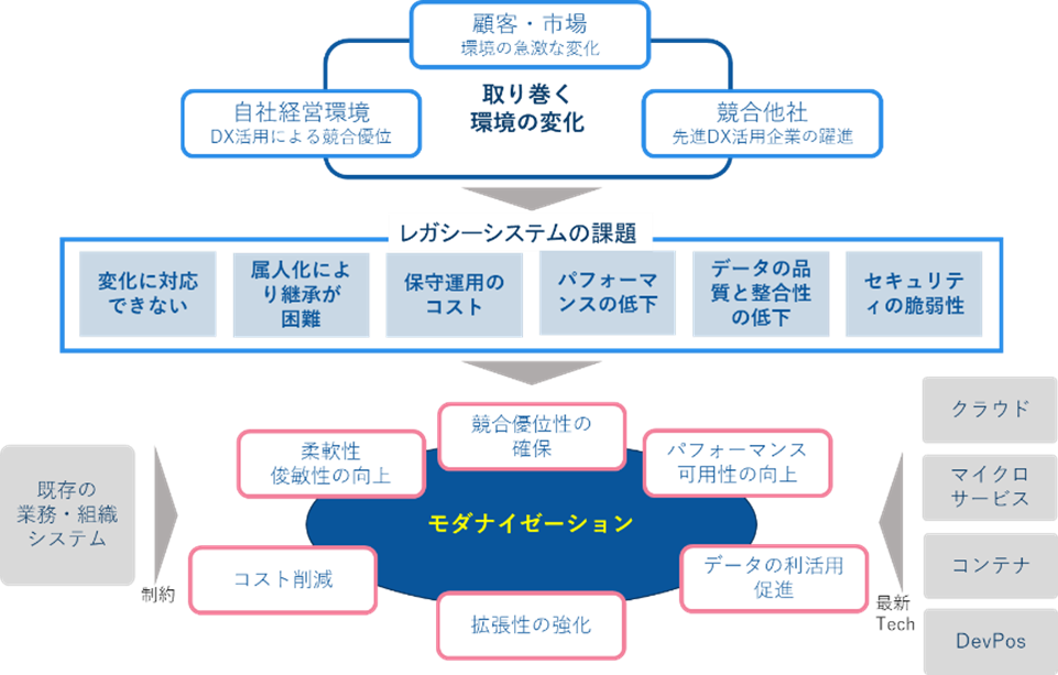 顧客や市場を取り巻く環境の変化に対応するため、現代の最新テクノロジーを駆使することで、将来の変化に対応する拡張性と柔軟性、可用性を高め、システムの属人化を排し、運用コストを削減するモダナイゼーションを活用することが重要です。