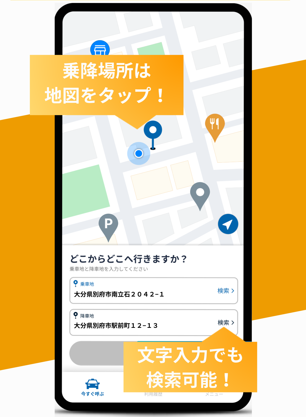 アプリを開くとGPS機能により現在地が自動的にお迎え場所となっている為、目的地を地図上から選択または検索して、「注文する」をタップすることですぐにタクシーを呼ぶことができます。