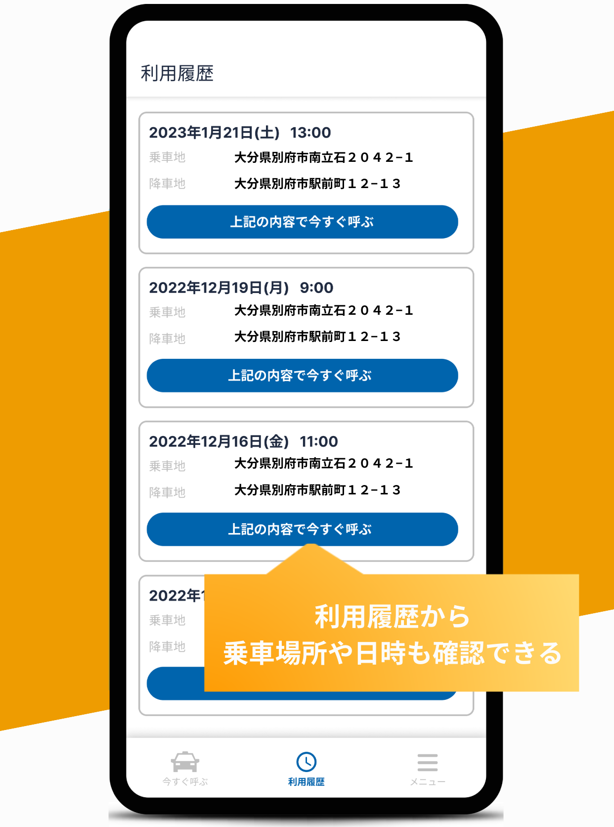 利用履歴から過去の利用実績の情報を確認することができます。さらに利用履歴から同じルートを予約することも可能です。