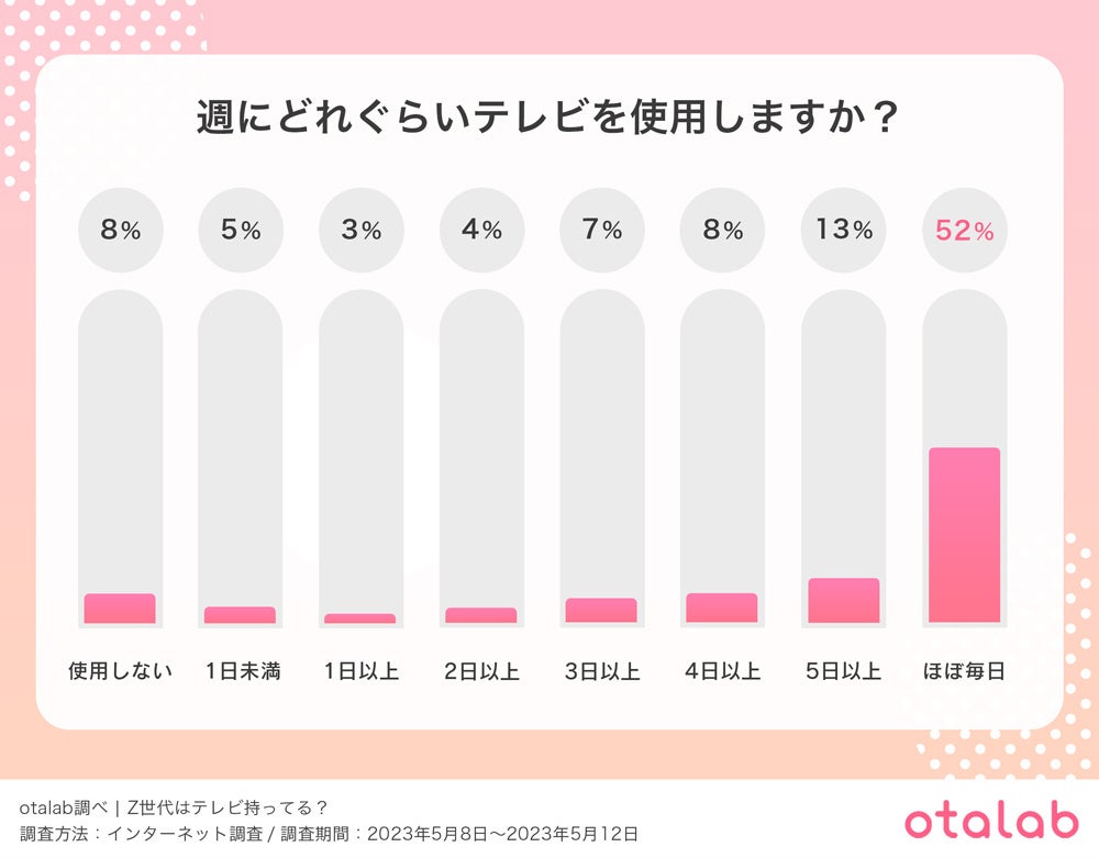 真相を知るべく「週にどれぐらいテレビを使用しますか?」という質問を行ったところ、Z世代の半分以上が『ほぼ毎日』テレビを使用していることが分かった。