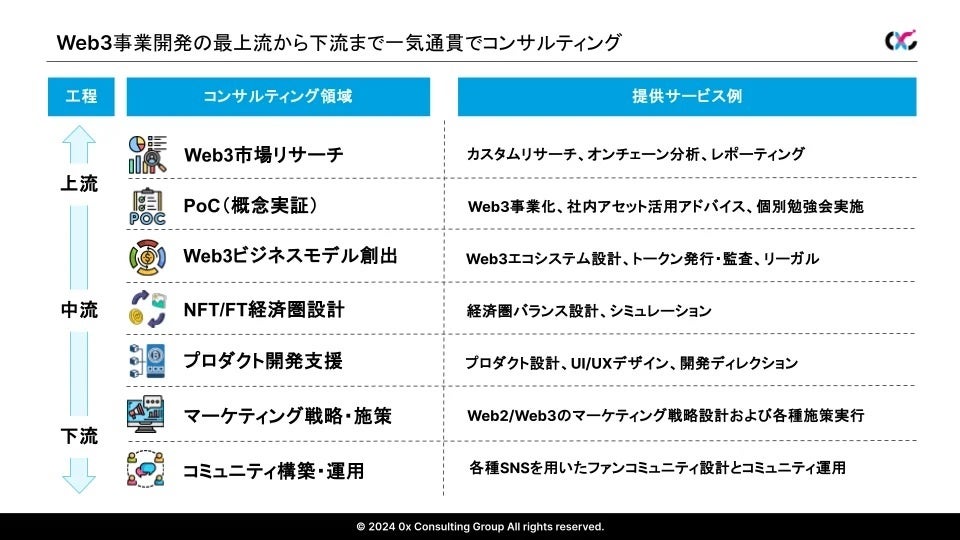 0x Consulting Groupは、Web3ビジネスの総合コンサルティングサービスを提供しています。PoC、NFT/FTを活用した新しいビジネスモデルの構築、マーケティング戦略立案、コミュニティ設計・運営、データ分析、ツール開発、リサーチメディア運営などを行っています。