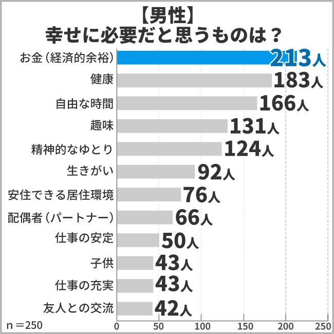 女性の「幸せに必要だと思うもの」の順位は、3位までが男性と全く同じですが、第1位の「お金(経済的余裕)」と回答した人数が男性の213人を上回る232人です。