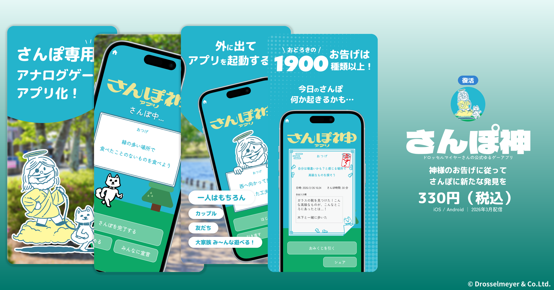 長期間にわたりApp Store・Google Playから削除されていた『さんぽ神』『空論道』がついに新バージョンで復活!さらに完全新作アプリとなる『ひまつぶ神』『大喜利神』も同時リリースとなります。4タイトルとも、ゲームデザイン・グラフィック・イラストは旧バージョンのクリエイターが継続して担当しています。
