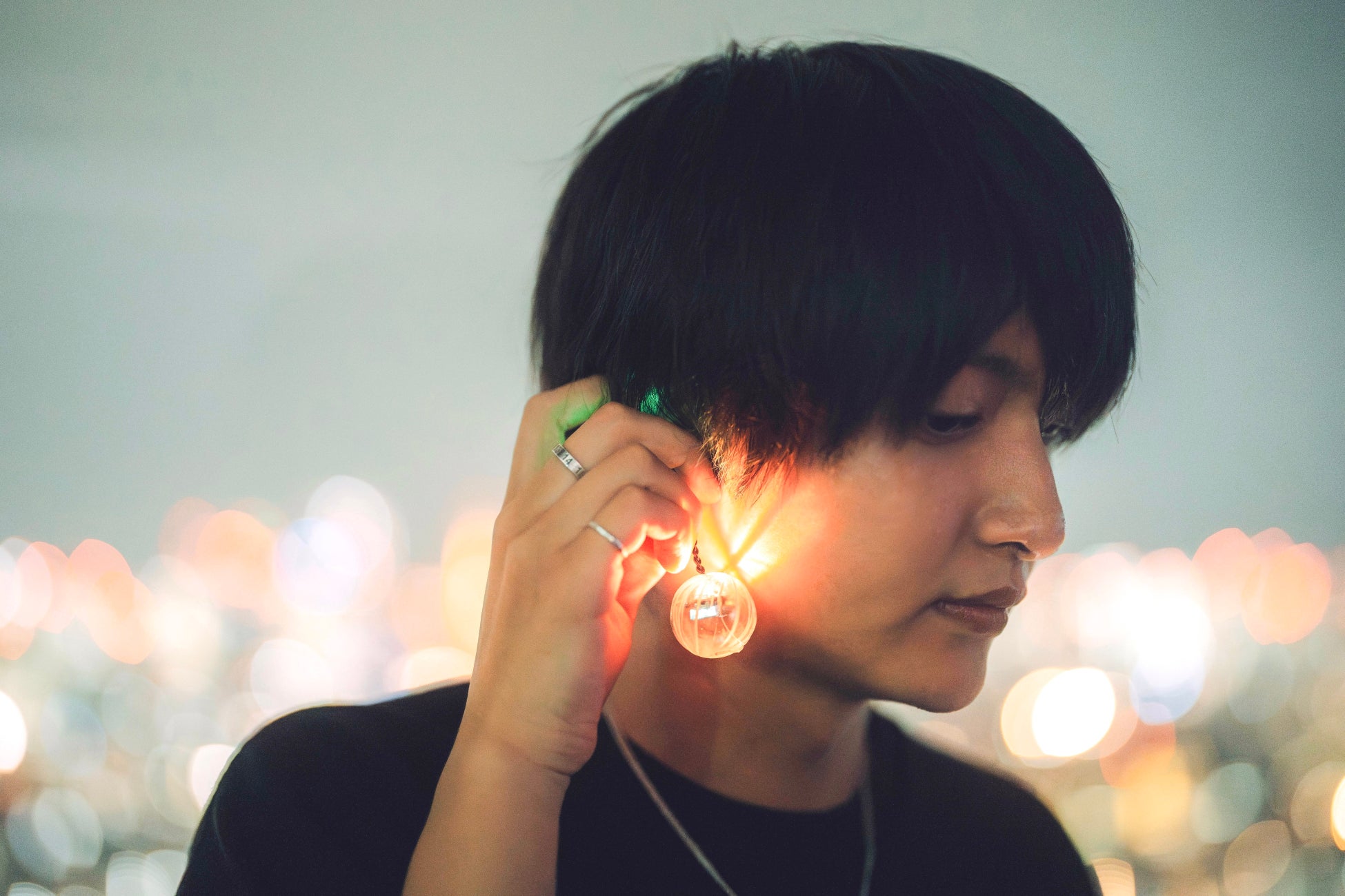 心拍に合わせて光るイヤリング型デバイス。単色で明滅。 e-lamp.オリジナルのボディーパーツを設計。 |