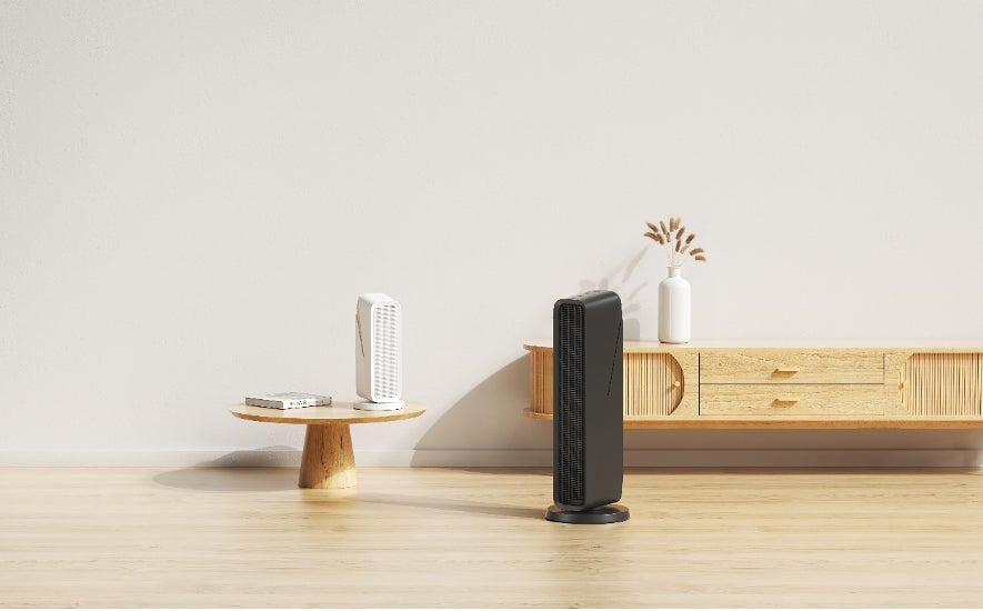 PKT-PTC1200PROは高さ54cmの縦長の送風口を備えた上位モデルで、足元まで暖まります。また、LEDパネルを搭載し、タイマーが確認しやすいほか、本体ボタンを4つに抑えたシンプル設計で、簡単に操作できます。さらに離れた場所から操作可能なリモコンが付属します。運転は自然風モード、弱、強の3段階に切り替え可能で、好みに合わせてご使用いただけます。そのほかのタイマーや安心機能はPKT-PTC1200と同じです。