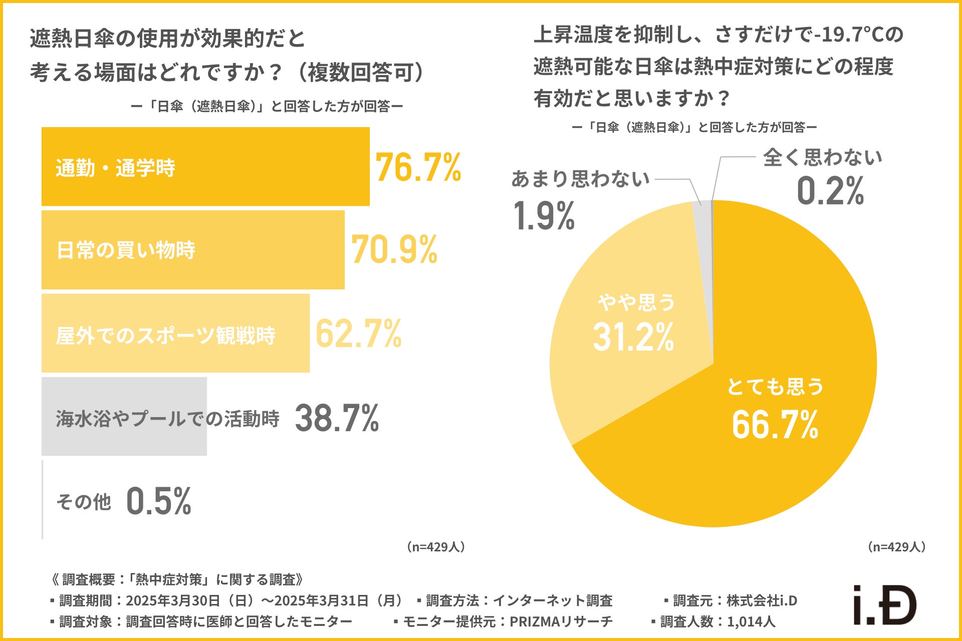 そこで今回、株式会社i.D(https://idtokyo.co.jp/)は、医師を対象に、熱中症の実態や対策、上昇温度-19.7°C※1※2※3遮熱可能な日傘に対しての意見を尋ねる「熱中症対策」に関する調査を実施しました。