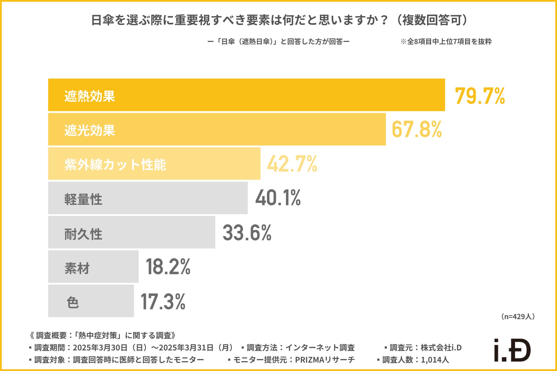 最後に「日傘を選ぶ際に重要視すべき要素は何だと思いますか?(複数回答可)」と質問したところ、『遮熱効果(79.7%)』と回答した方が最も多く、『遮光効果(67.8%)』『紫外線カット性能(42.7%)』と続きました。