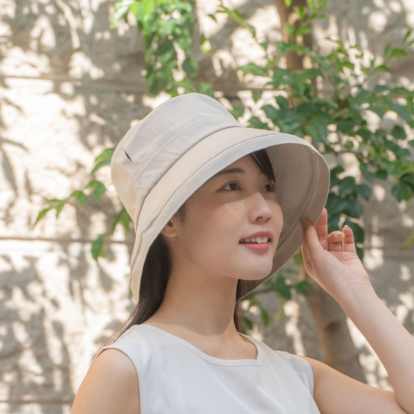 頭天井部分とつば部分に遮光率99.99%以上の1級遮光生地を使用しており、遮光・遮熱機能のある帽子であり、帽子のつば先も上げ下げできるので、顔周りをしっかりカバーできます。。髪や頭皮の紫外線ダメージを防ぎつつ、蒸れを防ぐ快適なかぶり心地も追求されています。