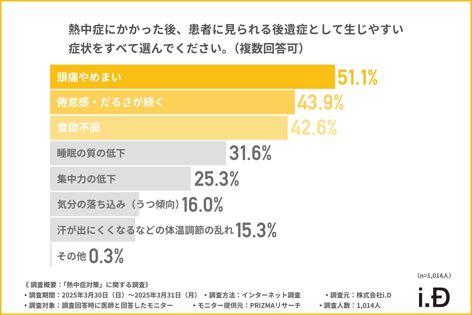 加えて、「熱中症にかかった後、患者に見られる後遺症として生じやすい症状をすべて選んでください(複数回答可)」と質問したところ、『頭痛やめまい(51.1%)』『倦怠感・だるさが続く(43.9%)』『食欲不振(42.6%)』が上位に挙げられました。