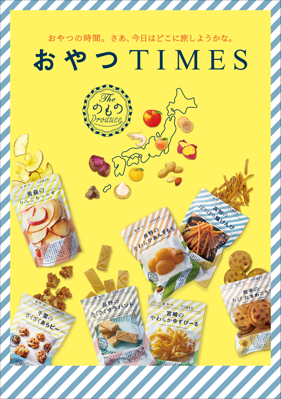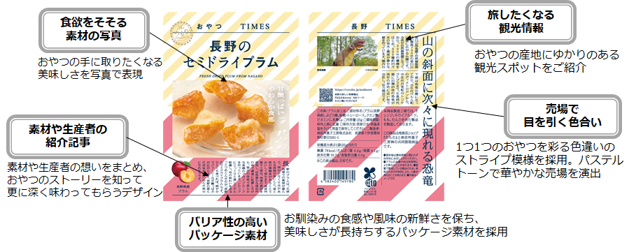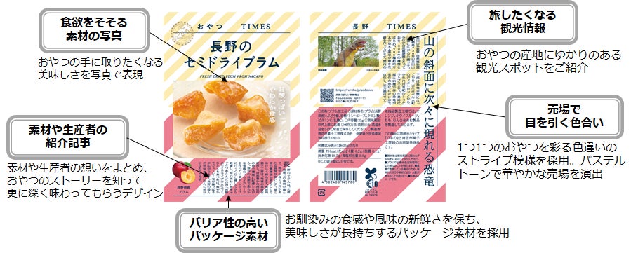 ●『おやつTIMES』は、東日本を中心に日本各地の素材や伝統菓子を「手に取りやすく」「食べやすい」かたちにした小袋菓子商品です。パッケージには、シズル感のあるメインビジュアルのほか、素材や生産者の紹介、地域の観光も掲載しています。