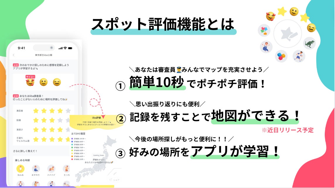 今回のリリースで「評価機能」が新しくリリースされました。おでかけするたびに訪れたスポットを「審査員」感覚で審査でき、満足度など各項目を評価をすることで、さらに便利にアプリを活用いただけます。評価することによって、家族の思い出が記録されるだけではなく、今後アプリが学習しおすすめの場所がレコメンドされるよう進化してまいります。