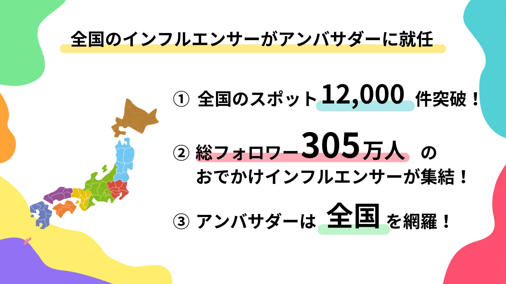 2023年10月のオープンベータ版リリース、2024年3月の大幅なアップデートを経て、スポットは1万2000件を突破し、サービスは大きく拡大をしています。子育てにおいて「インスタ検索」が主流になる中、インフルエンサーの情報は非常に重要です。今回、総フォロワーは300万人をこえる「子連れのおでかけインフルエンサー」が新たにアンバサダーとして就任し、フォロワーを巻き込む形でマップ作成を行なっています。