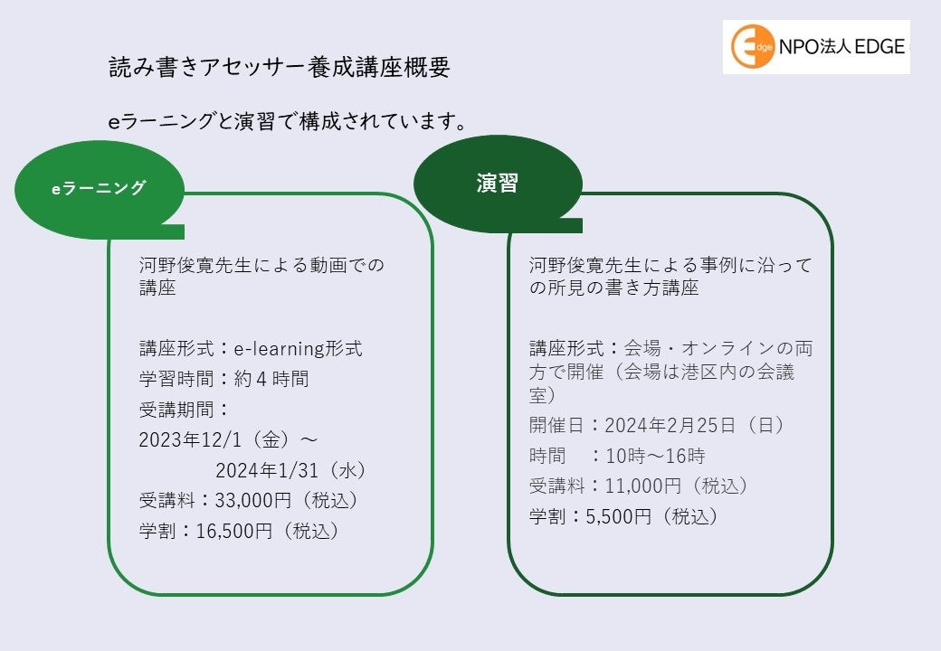 受講資格: 心理士系の資格保有者、教員、発達支援センター職員、放課後等児童デイサービス職員、特別支援教育専門員など支援に携わっている方、または認定NPO法人エッジ「読み書き困難指導支援講座」修了生