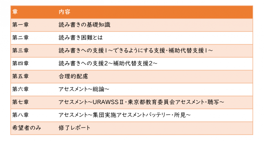 このコースは、日本語の読み書きの困難さの指標である読み書きの流暢性と正確性について学ぶことができ、読み書き困難のつらさに対して具体的な指導や支援の方法、考え方を導き出せるよう組み立てられています。